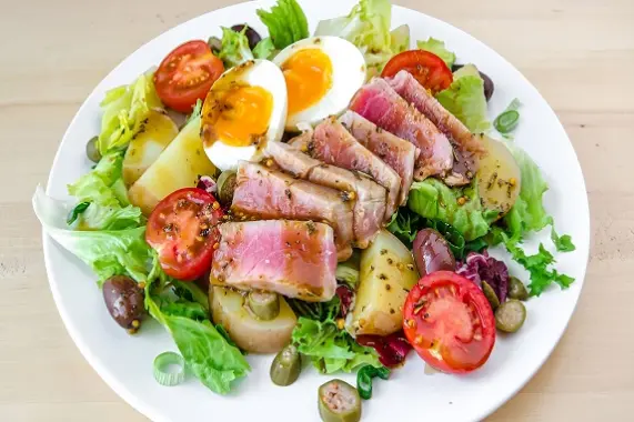 Помидоры, Огурцы, Шпинат, Петрушка, Укроп, Лук зеленый, Масло оливковое, Соль, Перец черный молотый, Горбуша, Кунжут белый, Маслины, Яйца куриные